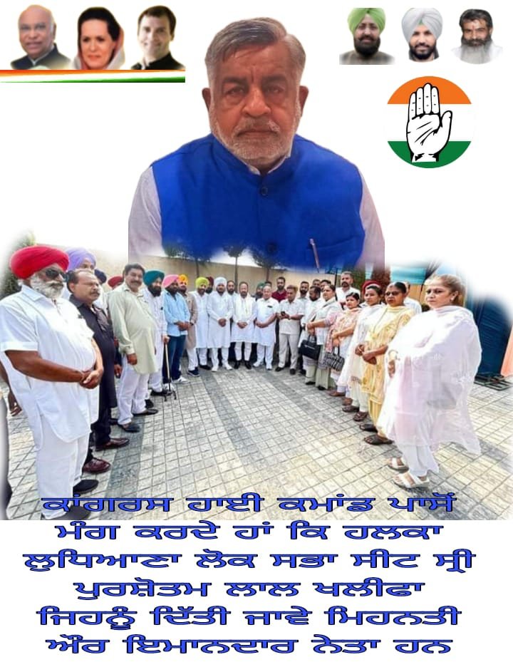 Today's, In short Shri Parshotam Lal Khalifa ji a well known personality in Politics no need to explain in person, His name's enough in Congress. His joining in Congress year '1975 S Giani Zail Singh ji tenure from NSUI , Youth Congress & Senior team of Congress with Party Leadership of S Darbara Singh ji, S Beant Singh ji, S Mohinder Singh Kaypee ji, S Shamsher Singh Dullo ji, Smt Rajinder Kaur Bhattal ji, S Amarinder Singh Raja ji & many more Leadership' till now he is working with us as Member of PPCC. His achievements in brief as a Cordinator of congress 8 year's in Lambi constituency, DRO Maharashtra, 30 Zimni elections of MLA & MP held under his coordination, Director Of Khadi Board, PRTC, Water Supply & Resources, Legal Advisor, Member of Lok Adalat & many more achievements in this time, Presently coordinator of East constituency of MLA Pandey ji from Ludhiana & Member of PPCC. So, Our Humble request infront of Senior leadership of Congress Kindly consider & Finalize the name of Shri Parshotam Lal Khalifa ji MP candidate from Ludhiana, So We can win this seat with huge margin of votes. He is a face of Congress from more than Five decade's with loyalty & Honest by Nature woking with Congress party & favourite of senior leadership, loved by Ludhanivis too. Dear Respected President Shri Malika Arjun Kharge ji, Shri KC Venugopal ji, Shri Davinder Yadav ji Punjab incharge, President S Amarinder Singh Raja ji to finalize the name of Honest & Loyal person Shri Parshotam Lal Khalifa ji as MP candidate from Ludhiana. The reason is our Party & we can need only loyal & Honest persons, different abilities to work for Party Leadership with regards Gurpreet Singh Sidhu Jai Hind !!