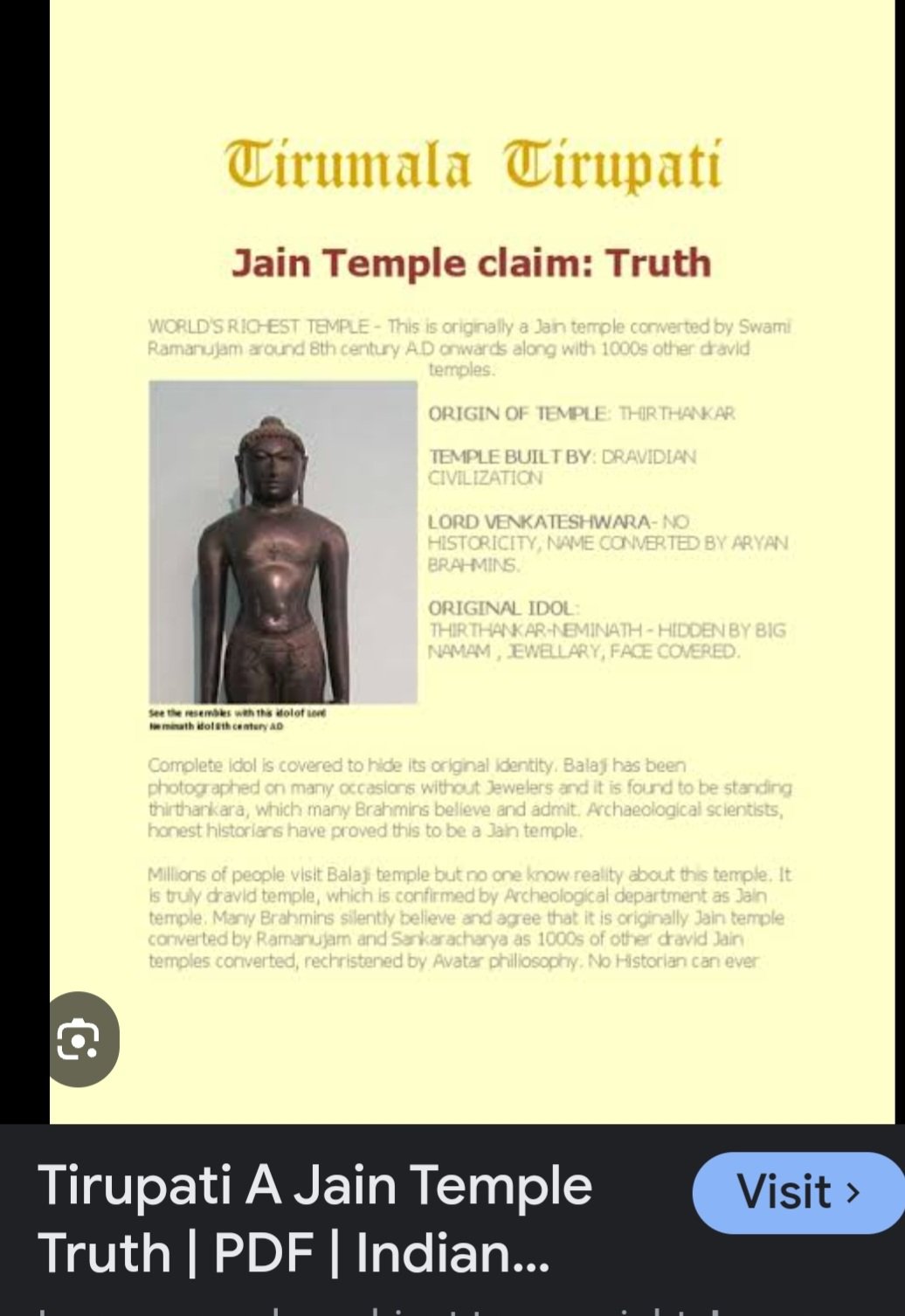 Millions of people visit Balaji temple but no one know reality about this temple. It is truly a Dravid temple, which is confirmed by Archaelogical department as Jain temple. Many brahmins silently believe and agree that it is originally Jain temple converted by Ramanujam and Sankaracharya as 1000s of other dravid Jain temples converted, rechristened by Avatar philiosophy. No Historian can ever claim that there was any god by name Lord Venkateshwara.