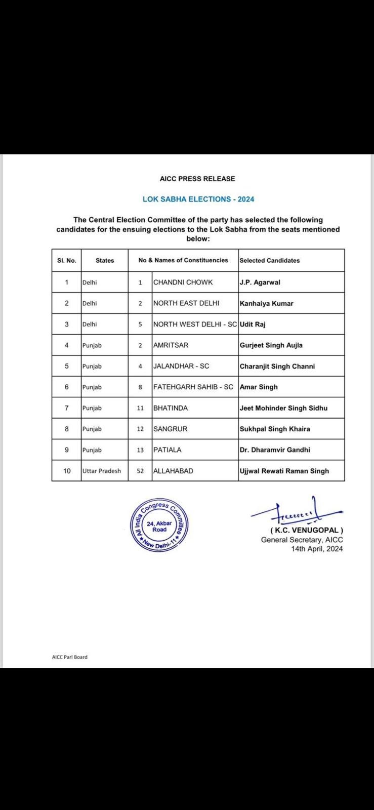 ਨਵੀਂ ਦਿੱਲੀ ਤੋਂ ਏ ਆਈ ਸੀ ਸੀ ਜਨਰਲ ਸਕੱਤਰ ਸ਼੍ਰੀ ਕੇ.ਸੀ ਵੇਣੂਗੋਪਾਲ ਨੇ ਲੋਕ ਸਭਾ ਚੋਣਾਂ ਲਈ ਦੂਜੀ ਸੂਚੀ ਜਾਰੀ ਕਰ ਦਿੱਤੀ ਹੈ। ਦੂਜੀ ਸੂਚੀ ਵਿੱਚ ਪੰਜਾਬ ਦੀਆਂ ਪੰਜ ਸੀਟਾਂ ਲਈ ਉਮੀਦਵਾਰਾਂ ਦਾ ਐਲਾਨ ਕੀਤਾ ਗਿਆ ਹੈ।