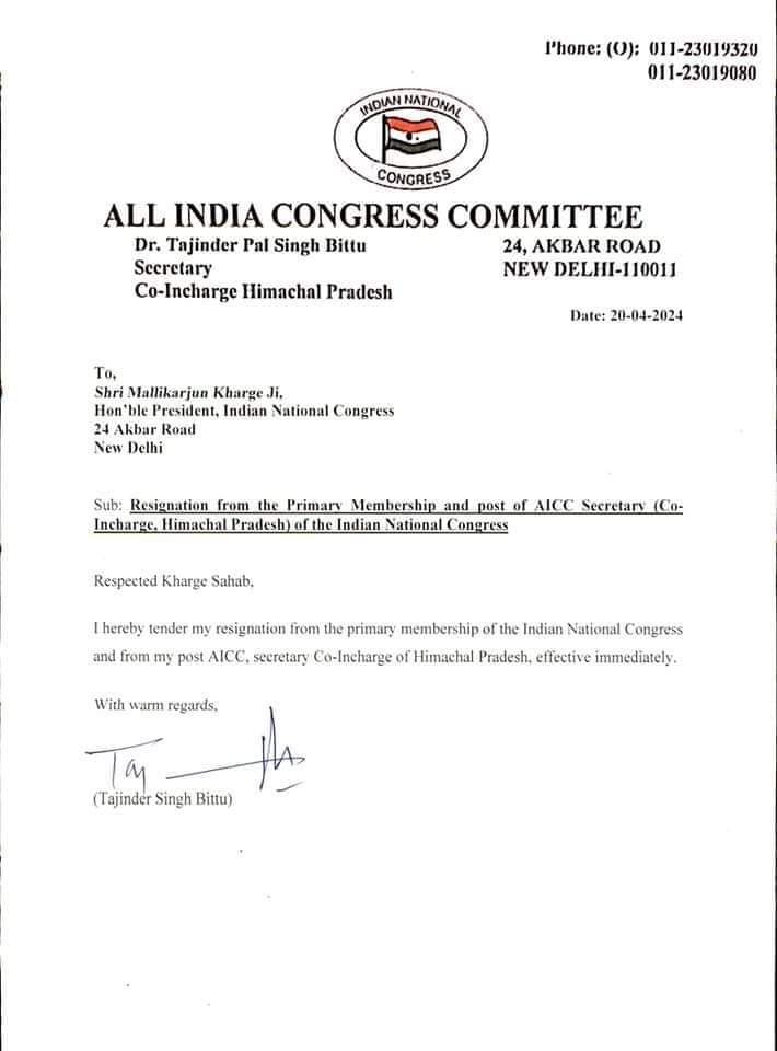 जालंधर (विक्रांत मदान)20अप्रैल 24:-बड़ी खबर अखिल भारतीय कांग्रेस कमेटी (एआईसीसी) के सचिव और हिमाचल प्रदेश के सह-प्रभारी तजिंदर सिंह बिट्टू ने शनिवार को कांग्रेस पार्टी की प्राथमिक सदस्यता से इस्तीफा दे दिया। बिट्टू को कांग्रेस की वरिष्ठ नेता प्रियंका गांधी का करीबी माना जाता है। कारन की पुष्टि नहीं हुई है।