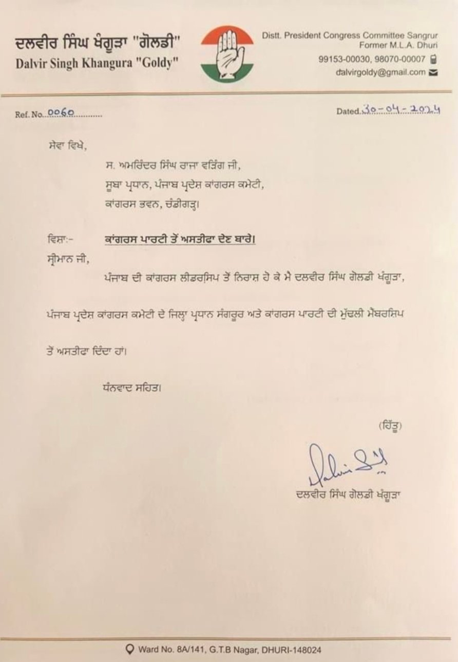 ਜਲੰਧਰ (ਵਿਕਰਾਂਤ ਮਦਾਨ) 30 ਅਪ੍ਰੈਲ 24:-ਕਾਂਗਰਸ ਪਾਰਟੀ ਦੇ ਯੁਵਾ ਨੇਤਾ ਅਤੇ ਜ਼ਿਲ੍ਹਾ ਪ੍ਰਧਾਨ ਦਲਬੀਰ ਗੋਲਡੀ ਨੇ ਦਿੱਤਾ ਅਸਤੀਫਾ । ਗੋਲਡੀ ਕਾਂਗਰਸ ਪਾਰਟੀ ਵੱਲੋਂ ਲੋਕ ਸਭਾ ਚੋਣਾਂ ਵਿੱਚ ਤੋਂ ਸੰਗਰੂਰ ਸੀਟ ਤੋਂ ਕਾਂਗਰਸੀ ਵਿਧਾਇਕ ਸੁਖਪਾਲ ਖਹਿਰਾ ਨੂੰ ਟਿਕਟ ਦਿੱਤੇ ਜਾਣ ਤੇ ਨਰਾਜ ਚੱਲੇ ਰਹੇ ਸਨ, ਉਹਨਾਂ ਨੇ ਇਸ ਨਰਾਜ਼ਗੀ ਦੇ ਚੱਲਦਿਆਂ ਪਾਰਟੀ ਤੋਂ ਅਸਤੀਫਾ ਦੇ ਦਿੱਤਾ ।