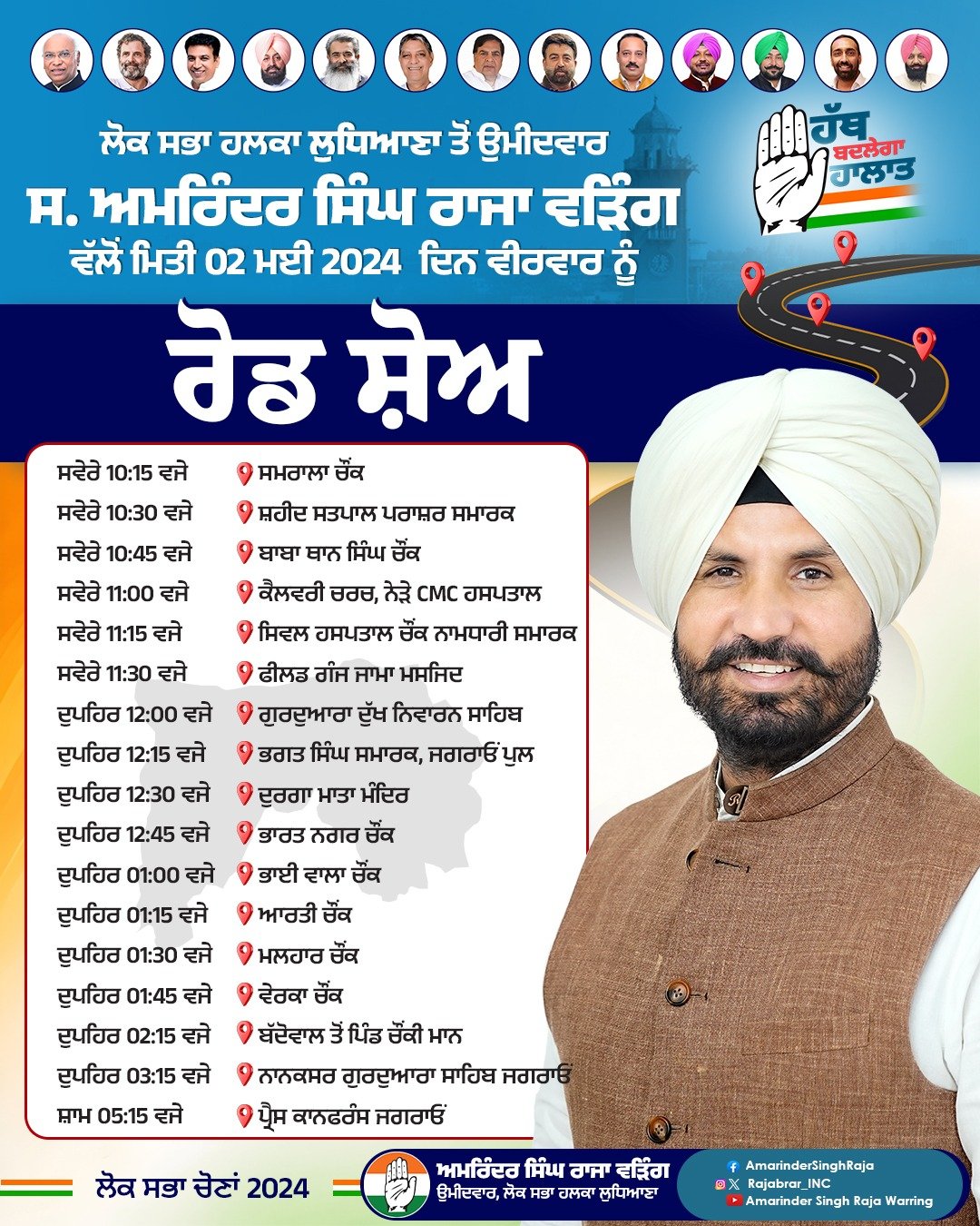 ਲੁਧਿਆਣਾ, ਅੱਜ ਮਿਤੀ 01 ਮਈ (ਵਿਕਰਾਂਤ ਮਦਾਨ) ਰਾਜਾ ਅਮਰਿੰਦਹ ਸਿੰਘ ਵੜਿੰਗ ਪ੍ਰਧਾਨ ਪੰਜਾਬ ਪ੍ਰਦੇਸ਼ ਕਾਂਗਰਸ ਅਤੇ ਲੁਧਿਆਣਾ ਲੋਕ ਸਭਾ ਹਲਕੇ ਤੋਂ ਕਾਂਗਰਸ ਦੇ ਉਮੀਦਵਾਰ ਕੱਲ ਕਰਨਗੇ ਰੋੜ ਸ਼ੋਅ ਜੋ ਕਿ ਸਵੇਰੇ 10 ਵੱਜੇ ਸਮਰਾਰਾ ਚੌਂਕ ਤੋਂ ਸ਼ੁਰੂ ਹੋ ਕੇ ਬਾਬਾ ਛਾਂ ਸਿੰਘ ਚੋਂਕ , ਫ਼ੀਲਡ ਗੰਜ ਜਾਮਾ ਮਸਜਿਦ, ਗੁਰਦੁਆਰਾ ਦੁੱਖ ਨਿਵਾਰਨ ਸਾਹਿਬ, ਦੁਰਗਾ ਮਾਤਾ ਮੰਦਿਰ, ਭਾਈ ਵੀਲਾ ਚੋਂਕ, ਮਲਾਹਾਰ ਚੌਂਕ, ਬਦੋਵਾਲ ਤੋਂ ਪਿੰਡ ਚੌਂਕੀ ਮਾਨ ਤੋਂ ਹੁੰਦੇ ਹੋਏ ਗੁਰਦੁਆਰਾ ਸਾਹਿਬ ਜਗਰਾਓਂ ਵਿਖੇ ਖਤਮ ਹੋਵੇਗਾ । ਉਸ ਤੋਂ ਬਾਦ ਸ਼ਾਮ 05.15 ਵਜੇ ਜਗਰਾਓਂ ਵਿਖੇ ਪ੍ਰੈਸ ਨੂੰ ਸੰਬੋਧਿਤ ਕਰਨਗੇ ।