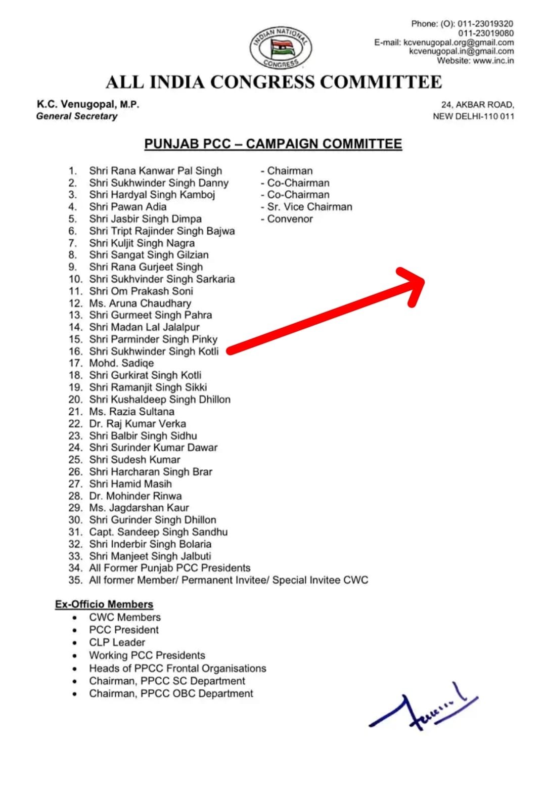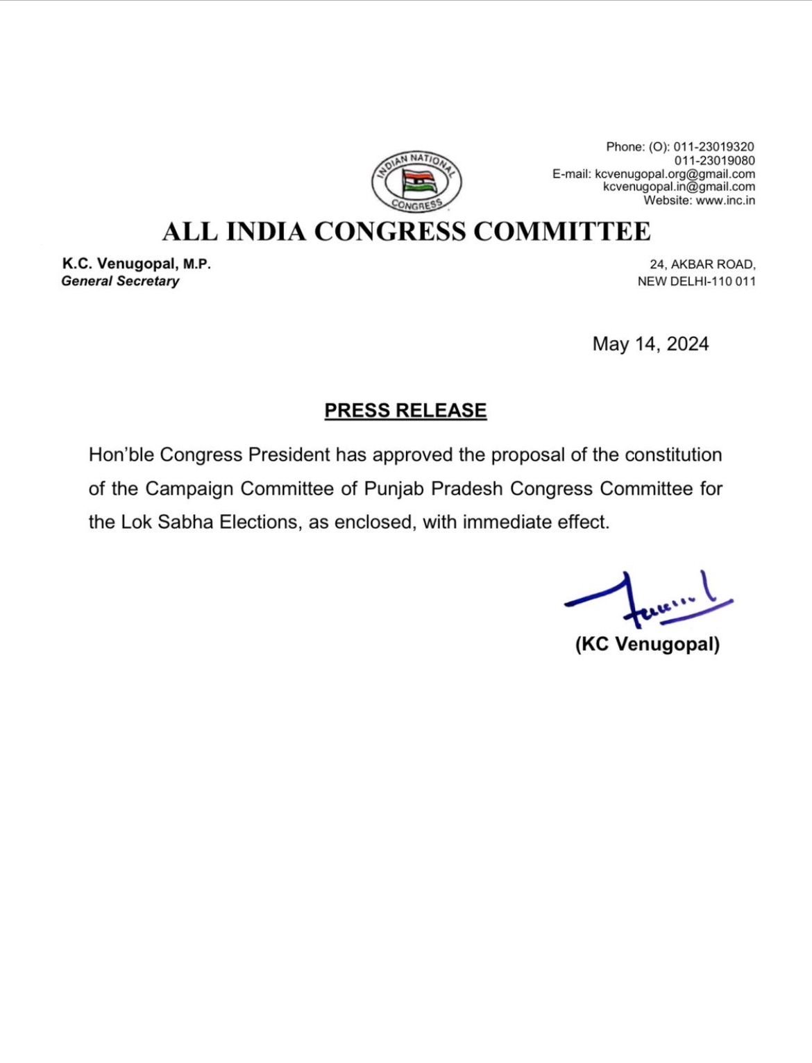 अखिल भारतीय कांग्रेस कमेटी के महासचिव वेनूगोपल ने पंजाब की 35 सदस्यी प्रचार कमेटी की घोषणा की जिसका पूर्ब स्पीकर पंजाब विधान सभा श्री राणा कंवर पाल सिंह को चेयरमैन बनाया गया।