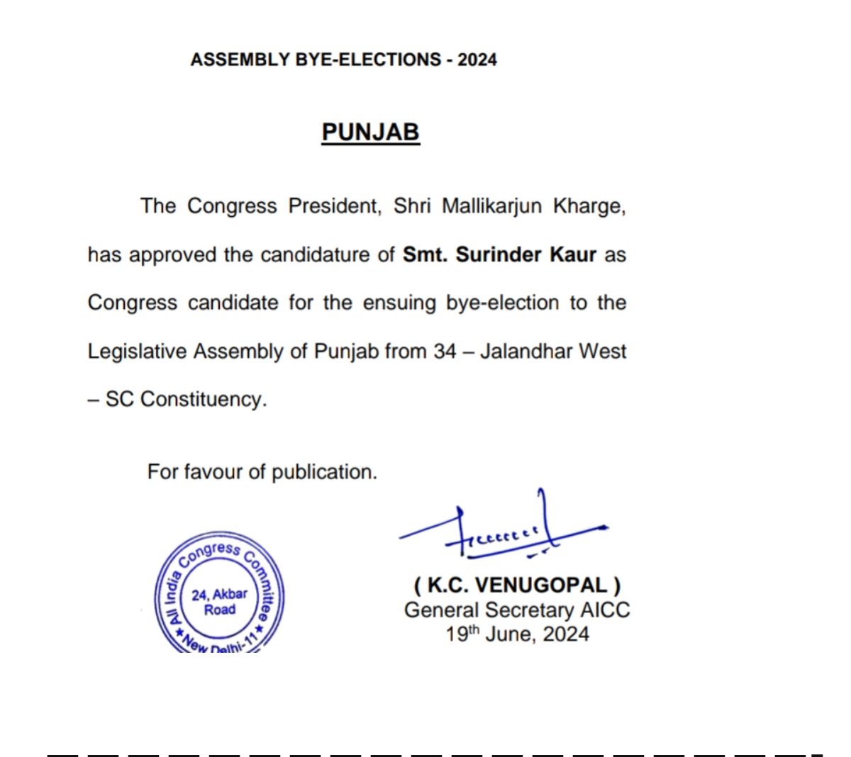 ਜਲੰਧਰ ਅੱਜ ਮਿਤੀ 19 ਜੂਨ (ਵਿਕਰਾਂਤ ਮਦਾਨ) : ਕਾਂਗਰਸ ਨੇ ਜਲੰਧਰ ਬੈਸਟ ਵਿਧਾਨ ਸਭਾ ਹਲਕਾ ਤੋਂ ਨਗਰ ਨਿਗਮ ਦੀ ਸਾਬਕਾ ਸੀਨੀਅਰ ਡਿਪਟੀ ਮੇਅਰ ਸੁਰਿੰਦਰ ਕੋਰ ਨੂੰ ਟਿਕਟ ਦਾ ਕੀਤਾ ਐਲਾਨ । ਇਸ ਆਲ ਇੰਡੀਆ ਕਾਂਗਰਸ ਕਮੇਟੀ ਦੇ ਜਰਨਲ ਸਕੱਤਰ ਵੇੰਨੂ ਗੋਪਾਲ ਨੇ ਚਿੱਠੀ ਜਾਰੀ ਕੀਤੀ ।