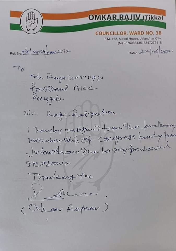 G2M ਜਾਲੰਧਰ(ਵਿਕਰਾਂਤ ਮਦਾਨ) 24ਜੂਨ24:-ਕਾਂਗਰਸ ਪਾਰਟੀ ਨੂੰ ਜਿਮਨੀ ਚੋਣਾਂ ਦੇ ਚਲਦੇ ਲੱਗਾ ਇਹ ਵੱਡਾ ਝੱਟਕਾ ਕਿ ਅੱਜ ਜਾਲੰਧਰ ਦੇ ਵਾਰਡ ਨੰਬਰ 38 (ਮਾਡਲ ਹਾਊਸ) ਦੇ ਕੌਂਸਲਰ ਨੇ ਦਿੱਤਾ ਆਪਣੀ ਪ੍ਰਾਇਮਰੀ ਮੈਂਬਰਸ਼ਿਪ ਤੋਂ ਅਸਤੀਫਾ ਓਹਨਾ ਨਾਲ ਗੱਲ ਬਾਤ ਕਰਦਿਆਂ ਉਹਨਾ ਨੇ ਦੱਸਿਆ ਕਿ, ਆਮ ਆਦਮੀ ਪਾਰਟੀ ਤੋਂ ਵੈਸਟ ਦੇ ਉਮ੍ਮੀਦਵਾਰ ਮੋਹਿੰਦਰ ਭਗਤ ਉਹਨਾ ਦੇ ਸਮਧੀ ਹਨ, ਇਸ ਕਰਕੇ ਓਹਨਾ ਦਾ ਇਹ ਫਰਜ਼ ਬਣਦਾ ਹੈ ਕਿ ਉਹ ਓਹਨਾ ਨੂੰ ਭਗਤ ਜੀ ਦੇ ਬਰਖਿਲਾਫ਼ ਪਰਚਾਰ ਨਹੀਂ ਕਰਨ ਚਾਹੀਦਾ ਯਾ ਉਹਨਾ ਦੇ ਵਿਰੋਧ ਵਿਚ ਖੜ੍ਹਨਾ ਨਹੀਂ ਚਾਹੀਦਾ ਹੈ ਇਹ ਉਹਨਾ ਦੀ ਡਿਊਟੀ ਬਣਦੀ ਹੈ, ਇਸ ਵਜ੍ਹਾਂ ਨੂੰ ਮੱਦੇਨਜ਼ਰ ਰੱਖਦੇ ਹੋਏ ਉਹਨਾ ਨੇ ਇਹ ਫੈਸਲਾ ਲਿਆ ਹੈ ਕਿ ਉਹ ਆਪਣੀ ਮੈਂਬਰਸ਼ਿਪ ਤੋਂ ਇਸਤੀਫਾ ਦੇ ਦੇਵਣ। ਓਂਕਾਰ ਰਾਜੀਵ ਟਿੱਕਾ ਨੇ ਗੱਲ ਬਾਤ ਕਰਦਿਆਂ ਇਹ ਵੀ ਦਸਿਆ ਕਿ ਅੱਜ ਓਹ ਆਮ ਆਦਮੀ ਪਾਰਟੀ ਵਿਚ ਸ਼ਾਮਿਲ ਹੋਣ ਜਾ ਰਹੇ ਹਨ।