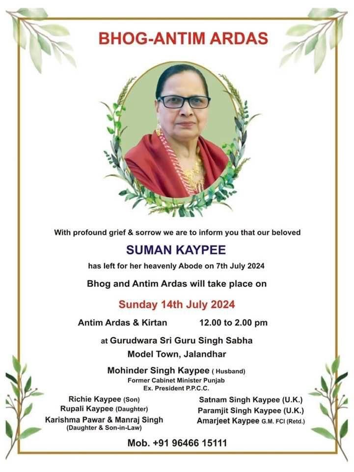 G2M ਜਲੰਧਰ 13 July 24 (ਵਿਕਰਾਂਤ ਮਦਾਨ) : ਅਕਾਲੀ ਦੱਲ ਦੇ ਸੀਨੀਅਰ ਨੇਤਾ ਅਤੇ ਸਾਬਕਾ ਐਮ ਪੀ ਸਰਦਾਰ ਮੋਹਿੰਦਰ ਸਿੰਘ ਕੇ.ਪੀ ਦੀ ਧਰਮ ਪਤਨੀ ਸਵਰਗਵਾਸੀ ਸੁਮਨ ਕੇਪੀ ਦਾ ਭੋਗ ਅਤੇ ਅੰਤਿਮ ਅਰਦਾਸ ਗੁਰਦਵਾਰਾ ਸ਼੍ਰੀ ਗੁਰੂ ਸਿੰਘ ਸਭਾ ਮਾਡਲ ਟਾਊਨ ਵਿਖੇ 14 ਜੁਲਾਈ ਦਿਨ ਐਤਬਾਰ ਦੋਪਹਰ 12.00- 2.00 ਭੋਗ ਹੋਵੇਗੀ।