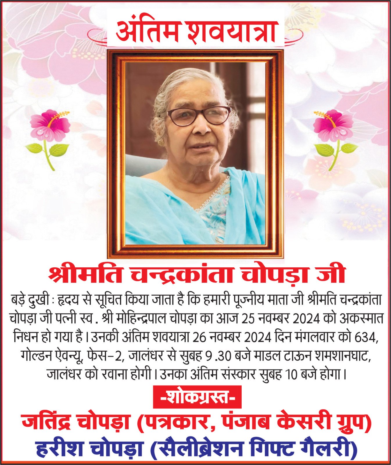 ਜਲੰਧਰ ਅੱਜ ਮਿਤੀ 25 ਨਬੰਵਰ (ਸੋਨੂੰ ਬਾਈ) : ਅੱਜ ਪੰਜਾਬ ਕੇਸਰੀ ਦੇ ਪੱਤਰਕਾਰ ਜਤਿੰਦਰ ਚੋਪੜਾ ਅੱਤੇ ਹਰੀਸ਼ ਚੋਪੜਾ ਦੀ ਮਾਤਾ ਸ੍ਰੀਮਤੀ ਚੰਦਰਕਾਂਤਾ ਚੋਪੜਾ ਦਾ ਅੱਜ ਦੇਹਾਂਤ ਹੋ ਗਿਆ ਉਹਨਾ ਦਾ ਅੰਤਿਮ ਸੰਸਕਾਰ ਕੱਲ 26 ਨਬੰਵਰ ਸਵੇਰੇ 10 ਵੱਜੇ ਮਾਡਲ ਟਾਊਨ ਸ਼ਮਸ਼ਾਨ ਘਾਟ ਵਿੱਖੇ ਹੋਵੇਗਾ।