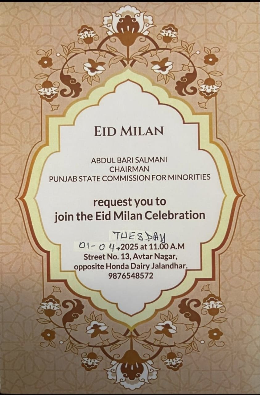 ਜਲੰਧਰ ਅੱਜ ਮਿਤੀ 30 ਮਾਰਚ (ਸੋਨੂੰ ਬਾਈ) :ਆਮ ਆਦਮੀ ਪਾਰਟੀ ਪੰਜਾਬ ਮਨੋਰਟੀ ਸੈਲ ਦੇ ਚੇਅਰਮੈਨ ਅਬਦੁਲ ਬਾਰੀ ਸੁਲੇਮਾਨੀ ਨੇ ਜਾਣਕਾਰੀ ਦਿੱਤੀ ਕਿ 1 ਮਾਰਚ ਦਿਨ ਮੰਗਲਵਾਰ ਤੋਂ ਚਾਰ 25 ਦਿਨ ਈਦ ਮਿਲਨ ਸਮਾਰੋਹ ਅਵਤਾਰ ਨਗਰ ਗਲੀ ਨੰਬਰ 13 ਹਾਡਾ ਡੈਰੀ ਦੇ ਸਾਹਮਣੇ ਵਿਖੇ ਕਰਾਇਆ ਜਾ ਰਿਹਾ । ਹੈ ਕਿ ਈਦ ਮਿਲਣ ਸਮਾਰੋ ਰਾਜਨੀਤੀ ਧਾਰਮਿਕ ਸਮਾਜਿਕ ਸ਼ਖਸੀਤਾਂ ਪਹੁੰਚਣਗੀਆਂ ।