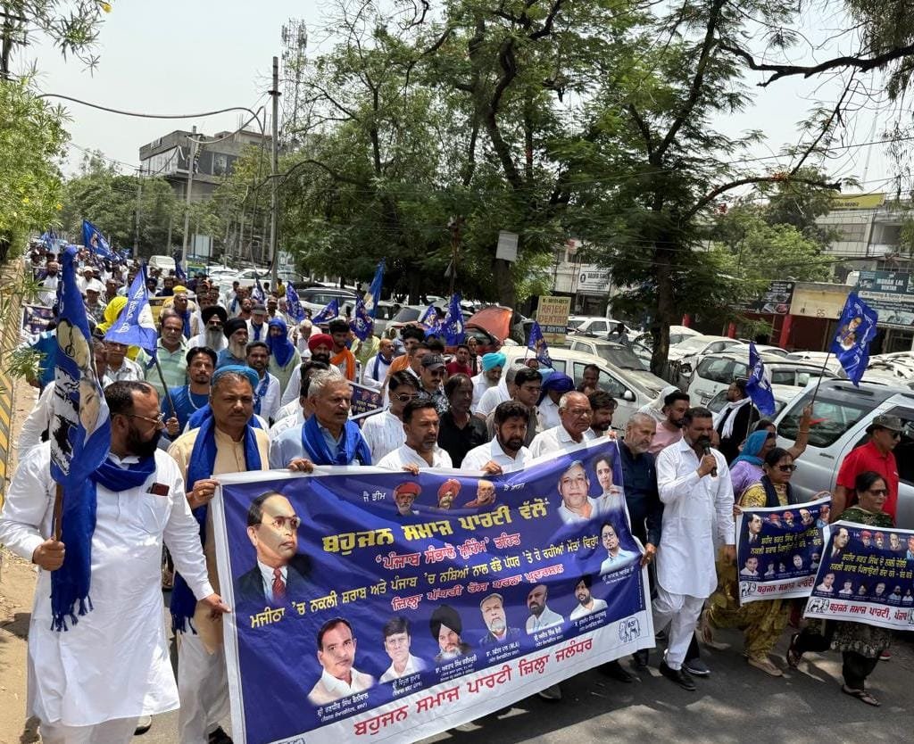 G2M ਵਿਕਰਾਂਤ ਮਦਾਨ 22 ਮਈ 2025 ਜਲੰਧਰ: ਬਹੁਜਨ ਸਮਾਜ ਪਾਰਟੀ (ਬਸਪਾ) ਵੱਲੋਂ ਅੱਜ ਨਸ਼ਿਆਂ ਦੇ ਮੁੱਦੇ 'ਤੇ ਸੂਬੇ ਭਰ ਵਿੱਚ ਸਾਰੇ ਜਿਲਾ ਹੈੱਡਕੁਆਰਟਰਾਂ 'ਤੇ ਪ੍ਰਦਰਸ਼ਨ ਕੀਤੇ ਗਏ। ਪਾਰਟੀ ਵੱਲੋਂ 'ਪੰਜਾਬ ਸੰਭਾਲੋ ਮੁਹਿੰਮ' ਤਹਿਤ ਦਿੱਤੇ ਇਸ ਪ੍ਰੋਗਰਾਮ ਮੁਤਾਬਕ ਜਲੰਧਰ ਵਿੱਚ ਵੀ ਬਸਪਾ ਆਗੂਆਂ ਤੇ ਵਰਕਰਾਂ ਨੇ ਵੱਡੇ ਪੱਧਰ 'ਤੇ ਸਰਕਾਰ ਖ਼ਿਲਾਫ਼ ਪ੍ਰਦਰਸ਼ਨ ਕੀਤਾ ਅਤੇ ਨਸ਼ੇ ਦੇ ਖਾਤਮੇ ਲਈ ਰਾਜਪਾਲ ਦੇ ਨਾਂ ਮੈਮੋਰੰਡਮ ਦਿੱਤਾ।