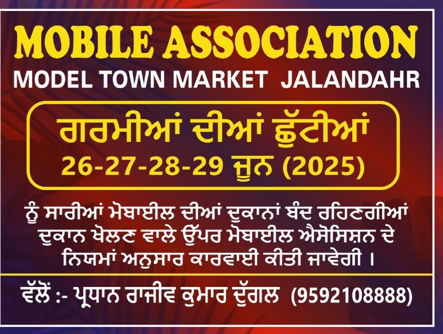 ਜਲੰਧਰ ਅੱਜ ਮਿਤੀ 6 ਜੂਨ (ਸੋਨੂੰ) ਮਾਡਲ ਟਾਊਨ ਦੀ ਮੋਬਾਈਲ ਐਸੋਸਿਏਸ਼ਨ ਨੇ ਗਰਮੀਆਂ ਛੁੱਟੀਆਂ ਕਰਨ ਦਾ ਫੈਸਲਾ ਕੀਤਾ ਜਿਸ ਅਨੁਸਾਰ ਮਾਡਲ ਟਾਊਨ ਮਾਰਕੀਟ ਦੀਆਂ ਸਾਰੀਆਂ ਮੋਬਾਈਲ ਦੀਆਂ ਦੁਕਾਨਾਂ 26-27-28-29 ਜੂਨ ਬੰਦ ਰਹਿਣਗੀਆਂ, ਇਸ ਦੀ ਪਾਲਣਾ ਨਾਂ ਕਰਨ ਵਾਲਿਆਂ ਤੇ ਮੋਬਾਈਲ ਐਸੋਸਿਸ਼ਨ ਦੇ