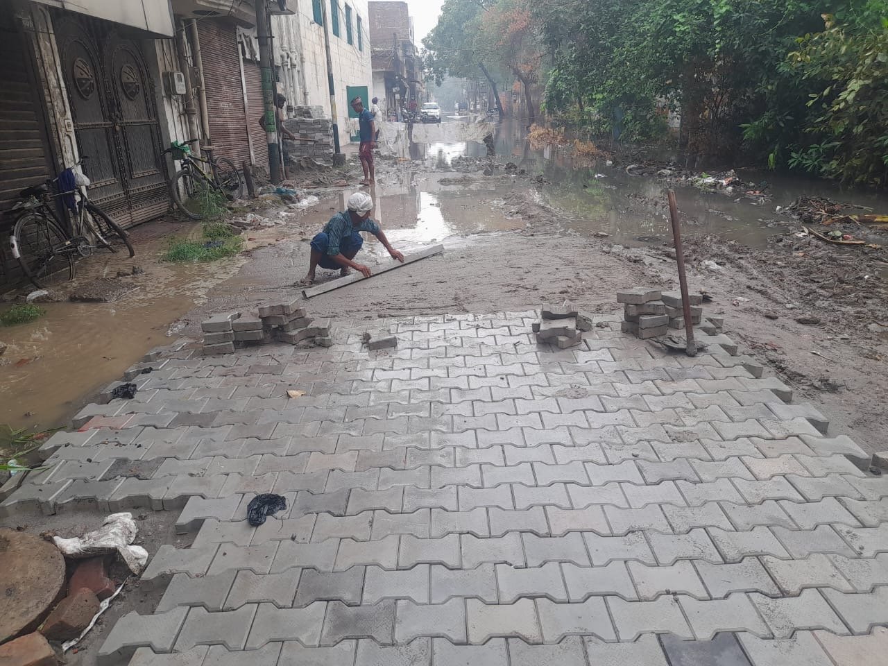 ਇੰਟਰਲੋਕਿੰਗ ਟਾਈਲਾ ਲਾਉਣ ਦਾ ਕੰਮ ਬਰਸਾਤ ਵਿੱਚ ਵੀ ਕੰਮ ਜਾਰੀ ।