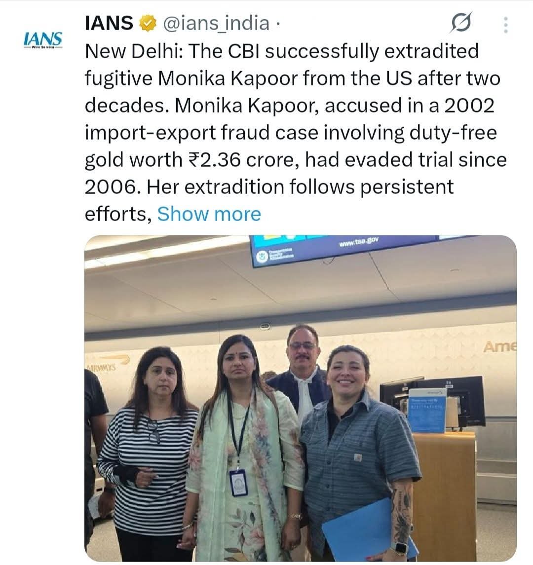 जालंधर : भारत में करोड़ों की धोखाधड़ी कर अमेरिका भागी मोनिका कपूर को आखिरकार CBI ने अमेरिका से गिरफ्तार कर भारत लाने में कामयाबी हासिल की है। करीब 26 साल से करोड़ों की धोखाधड़ी के मामले में फरार चल रही मोनिका कपूर को अब आखिरकार पकड़ लिया गया है। CBI की टीम उसे अमेरिका से भारत लेकर आ गई है।