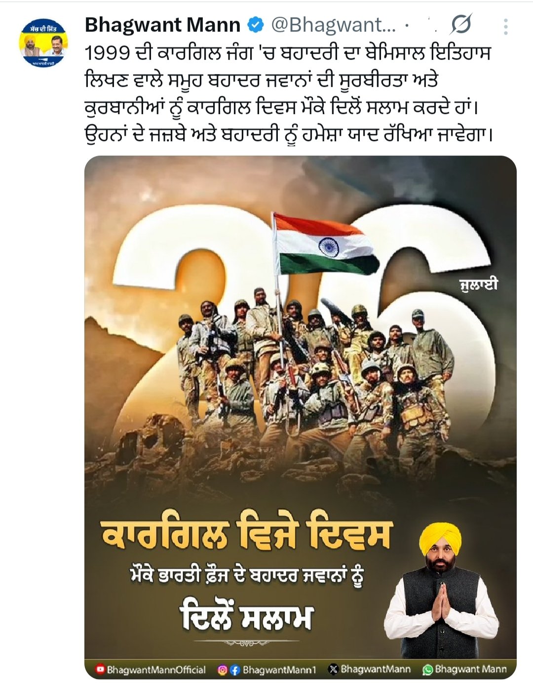 मुख्यमंत्री मान ने इस मौके पर एक भावुक ट्वीट करते हुए लिखा कि “कारगिल दिवस के अवसर पर, हम उन सभी वीर सैनिकों की वीरता और बलिदान को तहे दिल से सलाम करते हैं जिन्होंने 1999 के कारगिल युद्ध में बहादुरी का एक अद्वितीय इतिहास लिखा। उनकी बहादुरी और साहस को हमेशा याद रखा जाएगा।”