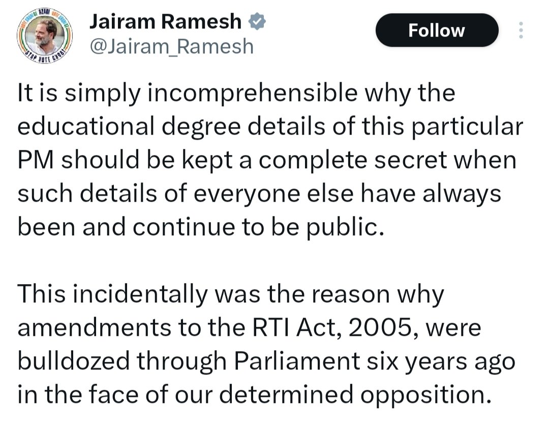 कांग्रेस महासचिव जयराम रमेश ने ‘X' पर पोस्ट किया, ‘‘यह समझ से परे है कि वर्तमान प्रधानमंत्री की शैक्षणिक योग्यता का विवरण पूरी तरह गुप्त क्यों रखा गया है,जबकि बाकी सभी के विवरण हमेशा से सार्वजनिक रहे हैं और आज भी हैं।''