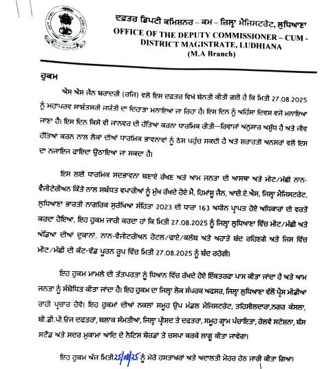 साथ ही डीसी ने बताया कि लुधियाना जिले में मांस/मछली और अंडे की दुकानें, नॉन वेजीटेरियन होटल/कसाईखाना/क्लब और अहाते 27 अगस्त को बंद रहेंगे और जिसमें मांस/मछली काटना पूरी तरह से बंद रहेगा। यह आदेश मामले की तात्कालिकता को ध्यान में रखते हुए एकतरफा पारित किया गया है और आम जनता को संबोधित है। यह आदेश जिला जनसंपर्क अधिकारी, जिला लुधियाना द्वारा प्रेस मीडिया के माध्यम से प्रचारित किया जा सकता है।