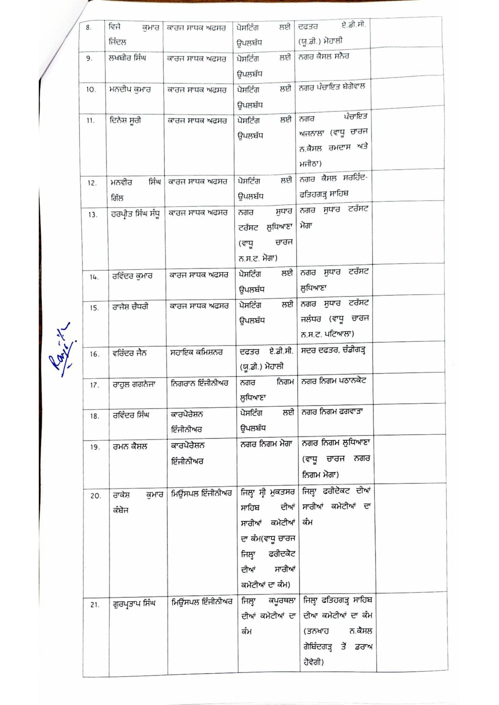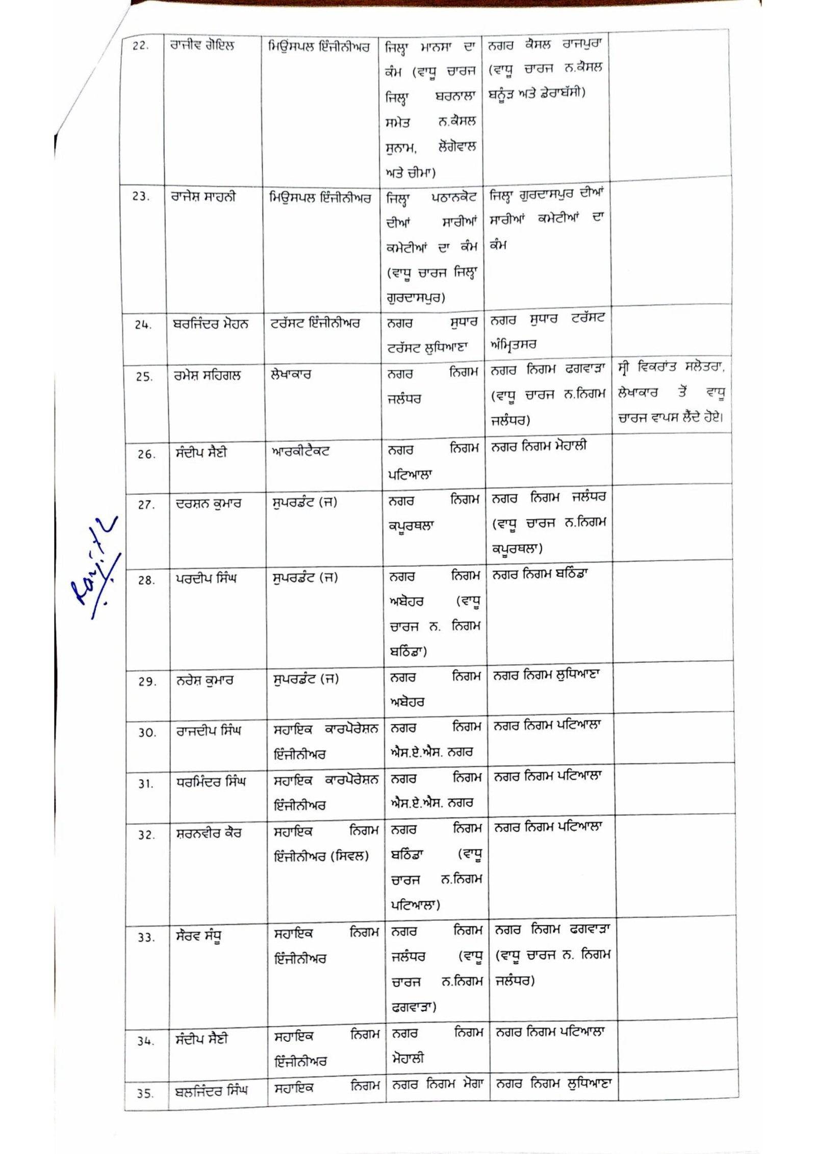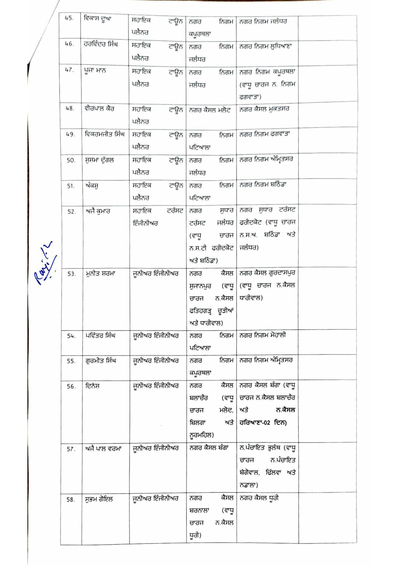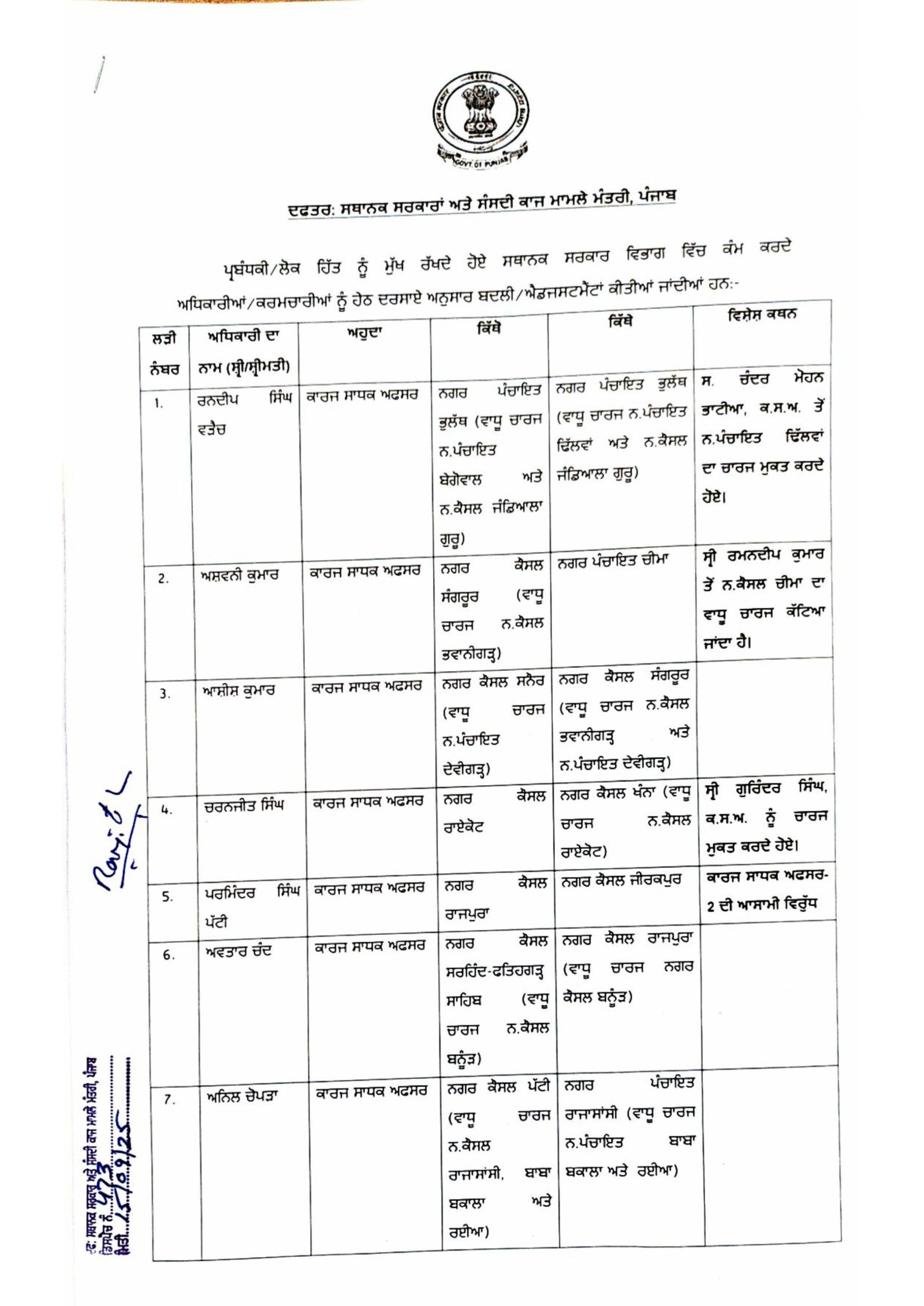 पंजाब (राजन) : सरकार द्वारा स्थानीय निकाय विभाग में बड़े स्तर पर तबादले किए गए हैं। जानकारी के अनुसार सरकार द्वारा जालंधर, लुधियान, अमृतसर और पटियाला जिलों में तबादले किए गए हैं। वहीं जालंधर नगर निगम में बिल्डिंग ब्रांच के अफसरों के भी तबादने होने की जानकारी मिली है। जिन अधिकारियों के तबादले हुए हैं उनकी सूची निम्न है।