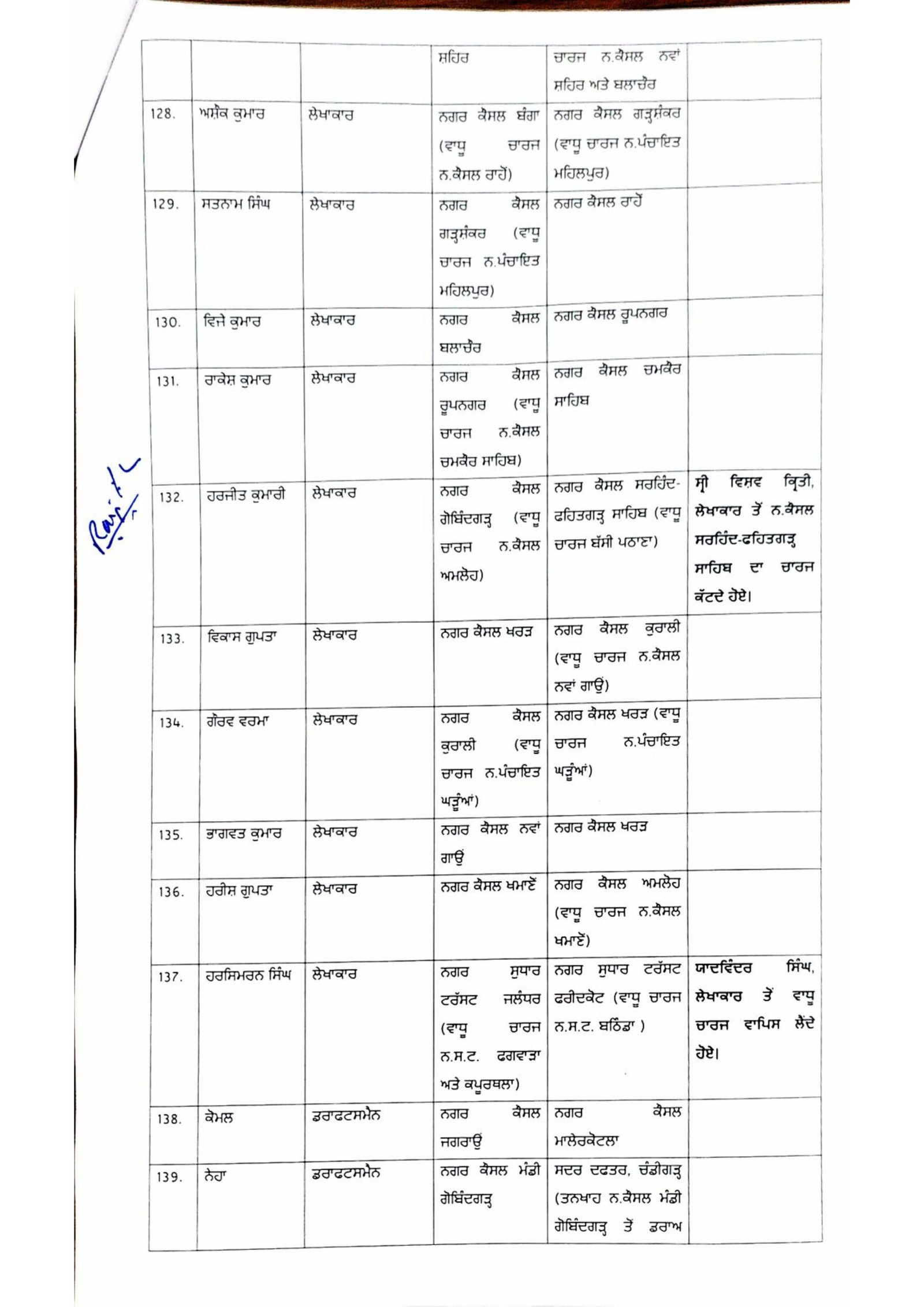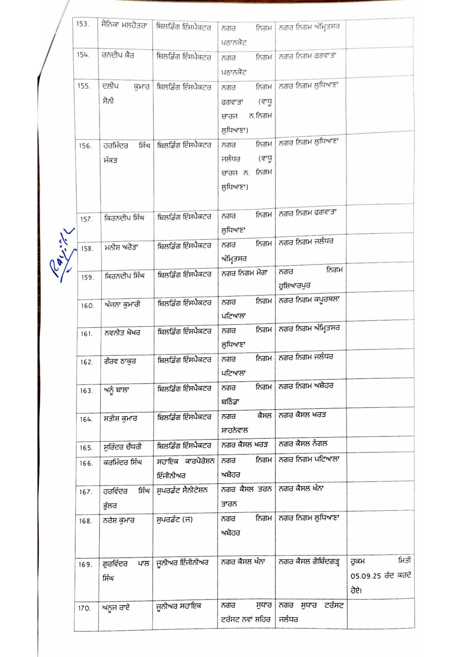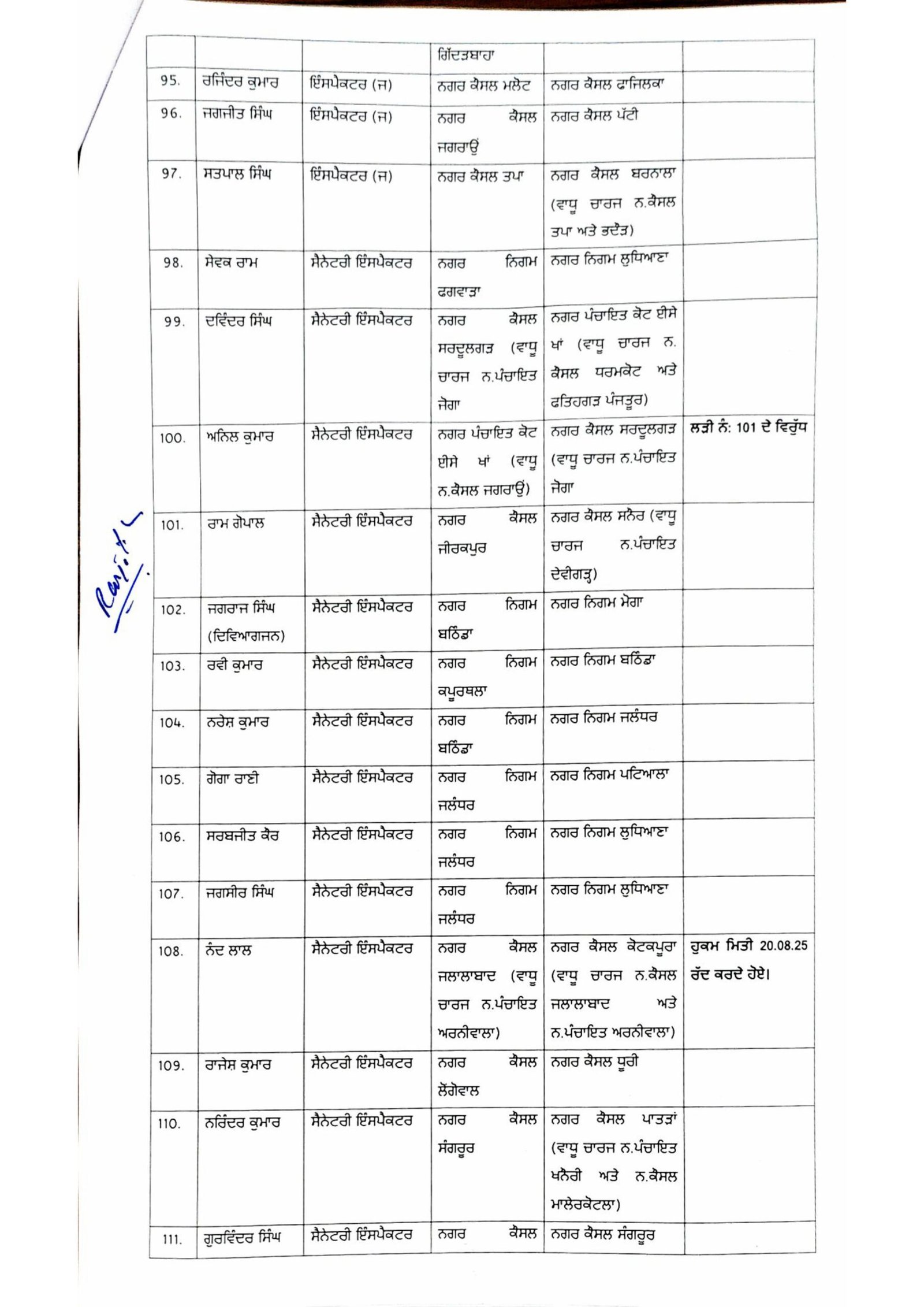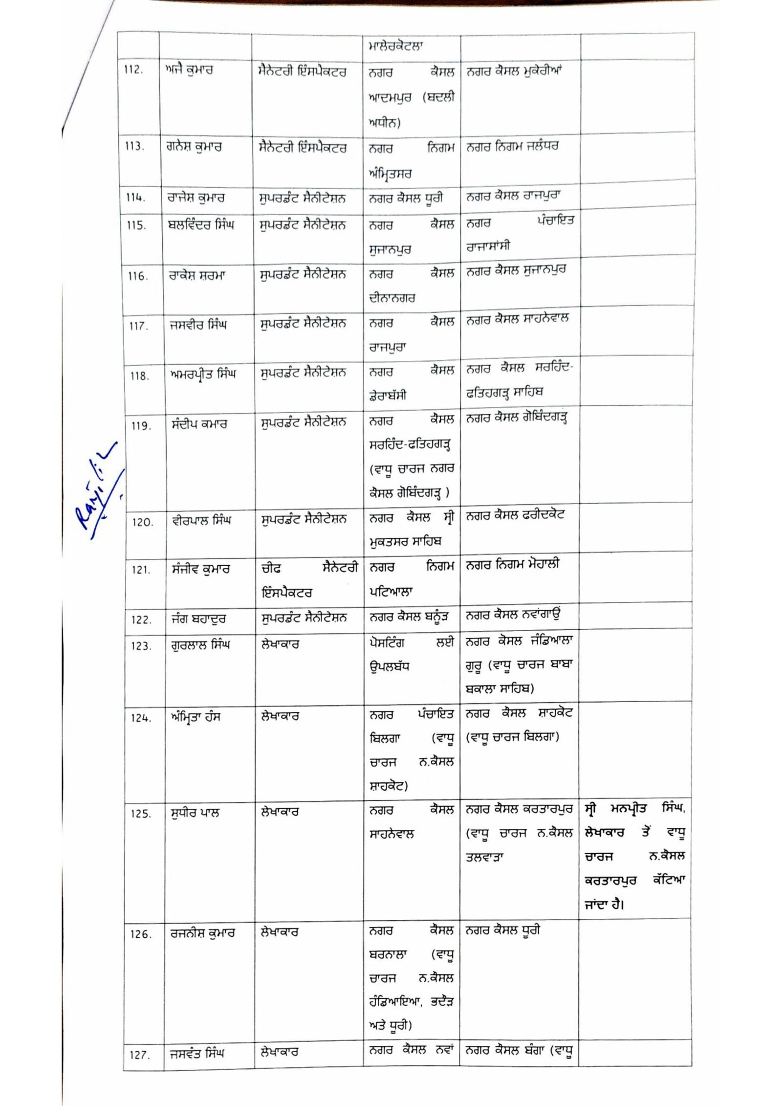 पंजाब (राजन) : सरकार द्वारा स्थानीय निकाय विभाग में बड़े स्तर पर तबादले किए गए हैं। जानकारी के अनुसार सरकार द्वारा जालंधर, लुधियान, अमृतसर और पटियाला जिलों में तबादले किए गए हैं। वहीं जालंधर नगर निगम में बिल्डिंग ब्रांच के अफसरों के भी तबादने होने की जानकारी मिली है। जिन अधिकारियों के तबादले हुए हैं उनकी सूची निम्न है।