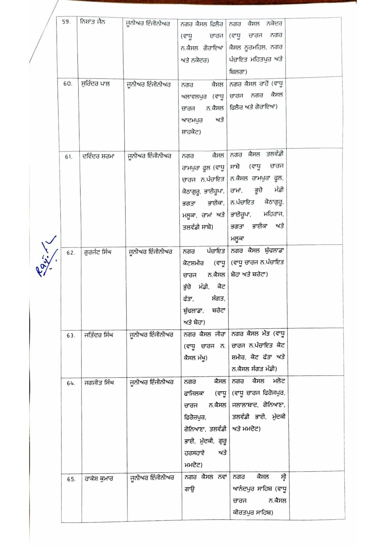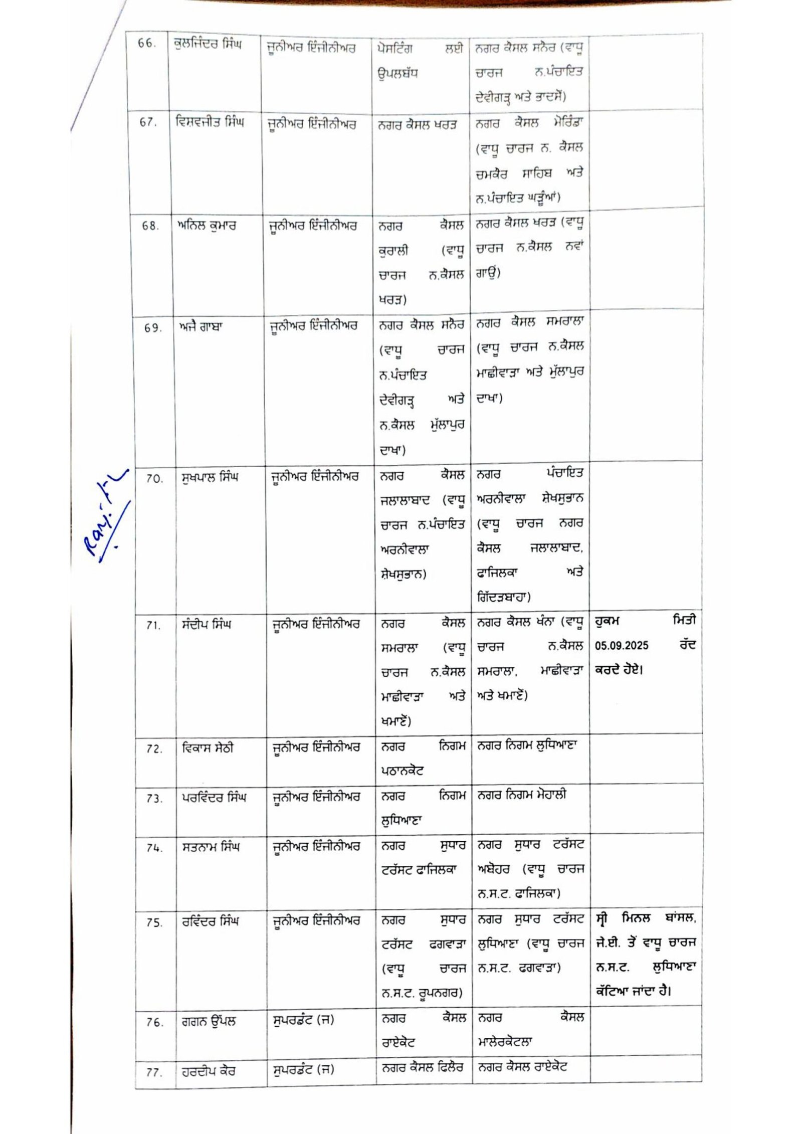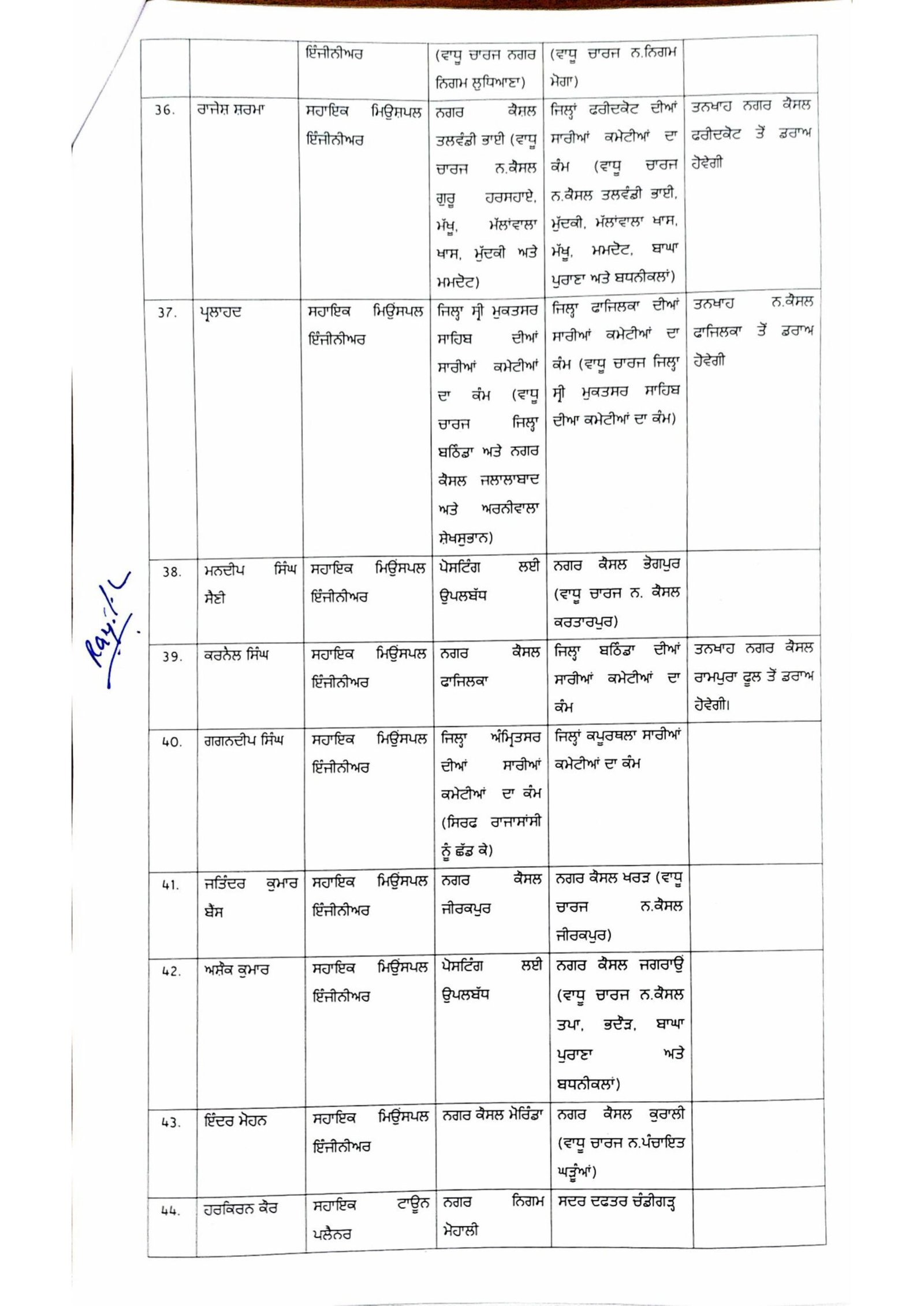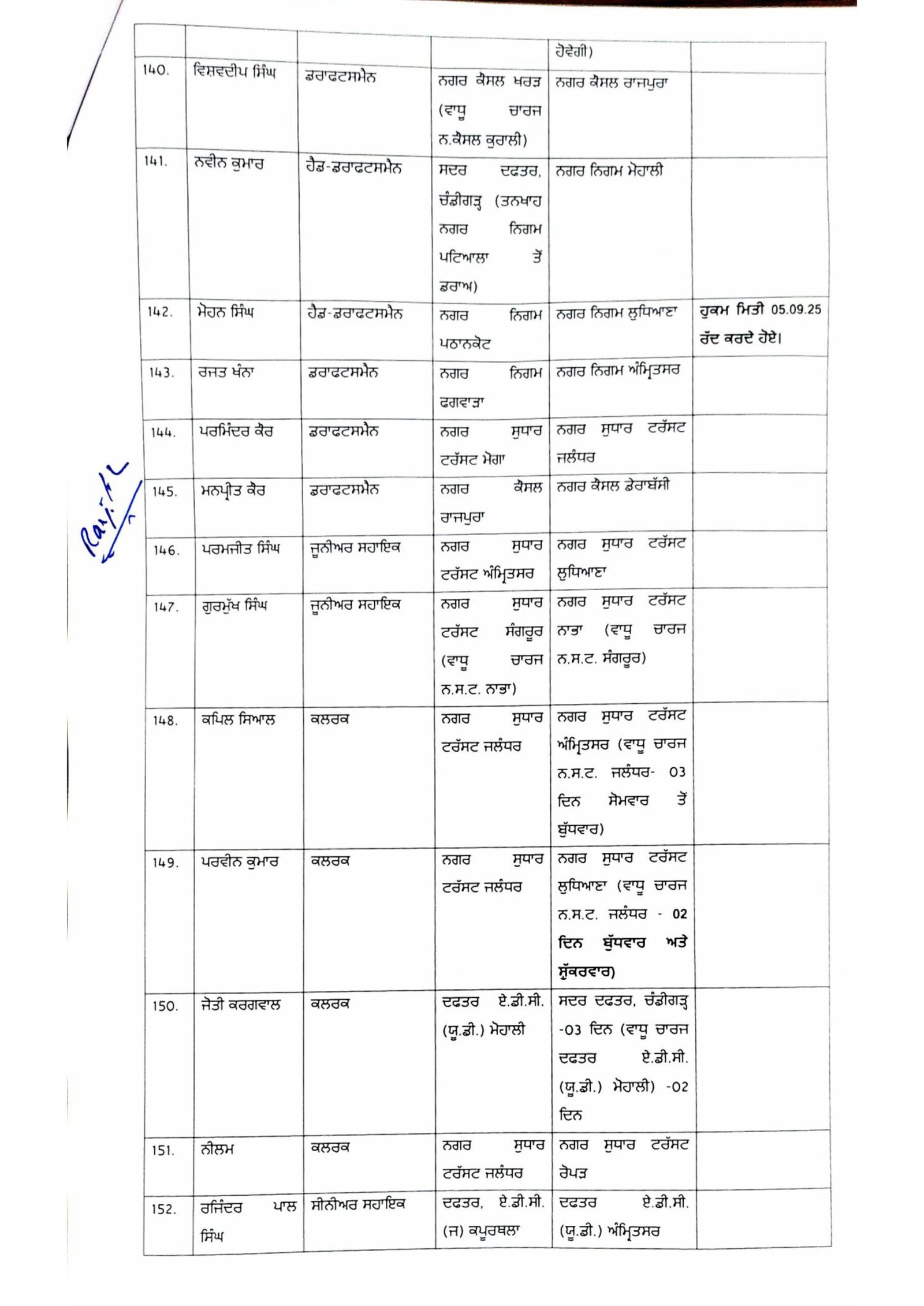 पंजाब (राजन) : सरकार द्वारा स्थानीय निकाय विभाग में बड़े स्तर पर तबादले किए गए हैं। जानकारी के अनुसार सरकार द्वारा जालंधर, लुधियान, अमृतसर और पटियाला जिलों में तबादले किए गए हैं। वहीं जालंधर नगर निगम में बिल्डिंग ब्रांच के अफसरों के भी तबादने होने की जानकारी मिली है। जिन अधिकारियों के तबादले हुए हैं उनकी सूची निम्न है।