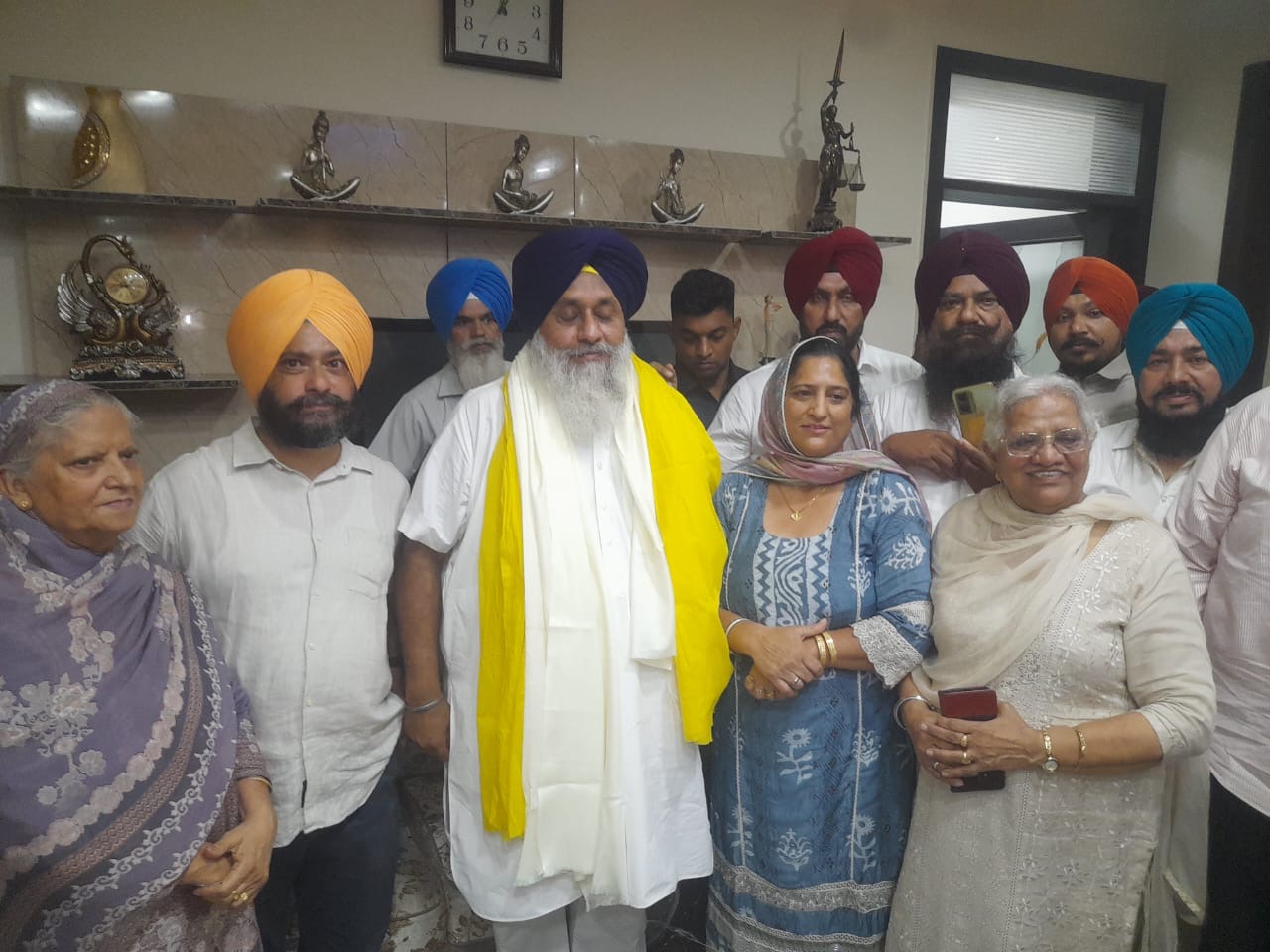 ਫਰੈਂਡ ਕਲੋਨੀ ਸੁਰਜੀਤ ਸਿੰਘ ਨੀਲਾ ਮਹਿਲ ਦੇ ਗ੍ਰਹਿ ਵਿਖੇ ਸੁਖਬੀਰ ਸਿੰਘ ਬਾਦਲ ਨਾਲ ਪਰਿਵਾਰਕ ਮੈਂਬਰ ਦਿਖਾਈ ਦੇ ਰਹੇ ਹਨ ।