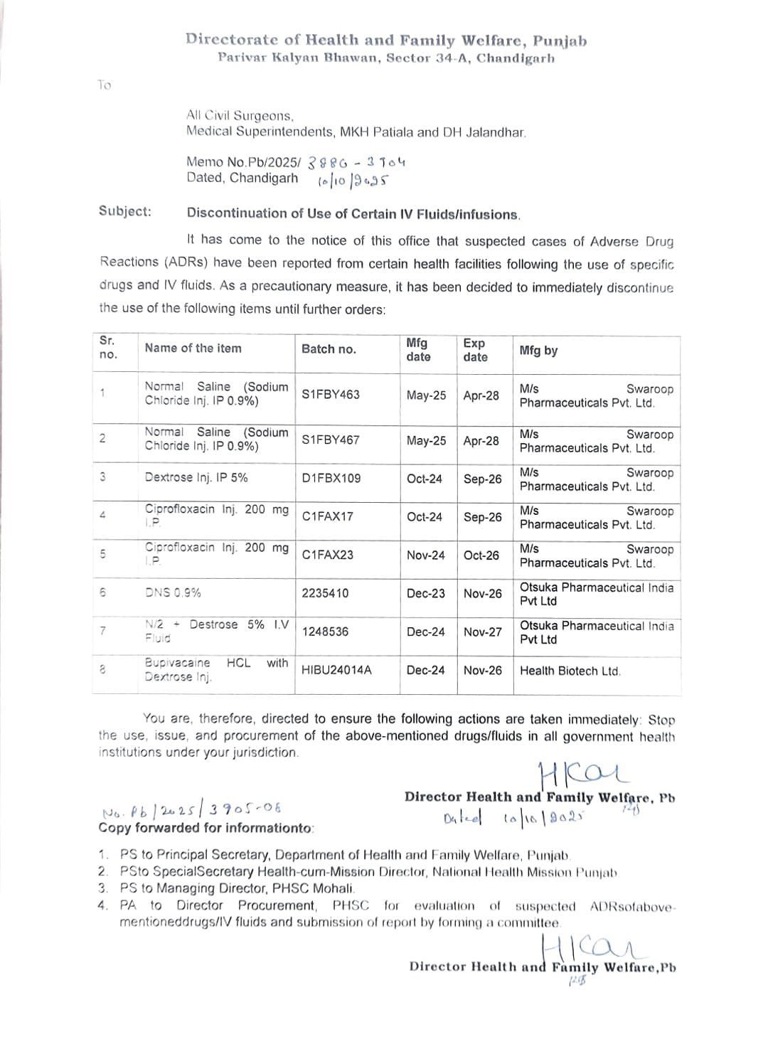 स्वास्थ्य एवं परिवार कल्याण विभाग द्वारा जारी नोटिफिकेशन के अनुसार मरीजों में इन दवाओं के प्रयोग के बाद रिएक्शन जैसी समस्याएं देखी गईं हैं। इस कारण विभाग द्वारा इन दवाओं की खरीद और इस्तेमाल पर रोक लगाने का फैसला किया है। जानकारी के अनुसार नॉर्मल सलाइन (Normal Saline, डेक्सट्रोज इंजेक्शन (Dextrose Inj.), सिपरोफ्लोक्सेसिन इंजेक्शन (Ciprofloxacin Inj.), डी.एन.एस. 0.9% (DNS 0.9%), एन/2 + डेक्सट्रोज 5% IV फ्लूइड (N/2 + Destrose 5% I.V Fluid), बुपीवाकेन (Bupivacaine) HCL with Dextrose Inj. को बैन किया गया है।
