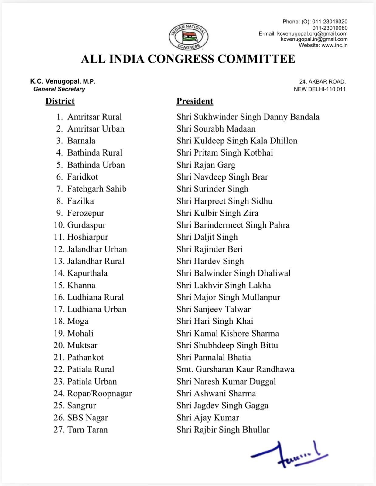 ਜਲੰਧਰ ਅੱਜ ਮਿਤੀ 11 ਨਵੰਬਰ (ਸੋਨੂੰ) ਆਲ ਇੰਡੀਆ ਕਾਂਗਰਸ ਪਾਰਟੀ ਦੇ ਜਨਰਲ ਸਕੱਤਰ ਵੇਣੂਗੋਪਾਲ ਨੇ ਪੰਜਾਬ ਦੇ ਜਿਲ੍ਹਾ ਪ੍ਰਧਾਨਾ ਦੀ ਸੂਚੀ ਜਾਰੀ ਕੀਤੀ । ਜਿਸ ਵਿੱਚ ਜਿਆਦਾਤਰ ਪੁਰਾਣੇ ਜ਼ਿਲਾ ਪ੍ਰਧਾਨਾਂ ਤੇ ਭਰੋਸਾ ਕੀਤਾ ।