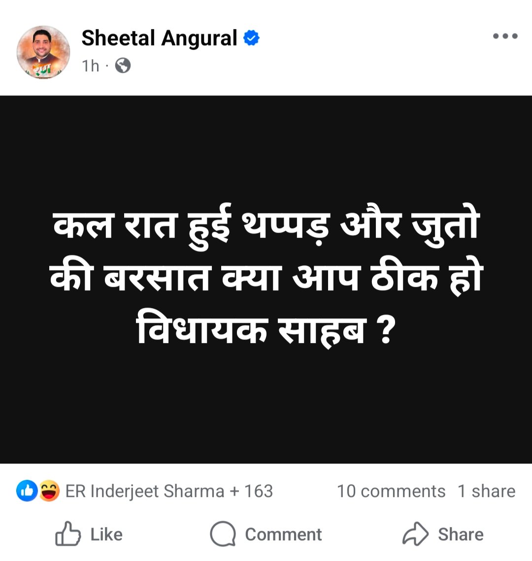 पोस्ट में अंगुराल ने लिखा— कल रात हुई थप्पड़ और जुतों की बरसात… क्या आप ठीक हो विधायक साहब ? इस एक लाइन ने सोशल मीडिया पर हलचल मचा दी। लोगों को समझ नहीं आ रहा कि भाजपा नेता आखिर किस विधायक की बात कर रहे हैं। इस पोस्ट के बाद कमैंट्स की बाढ़ आ गई है और यूजर्स लगातार पूछ रहे हैं