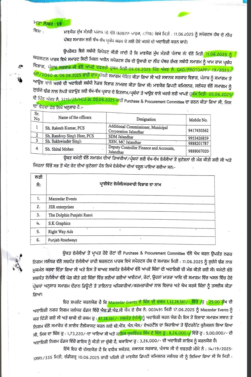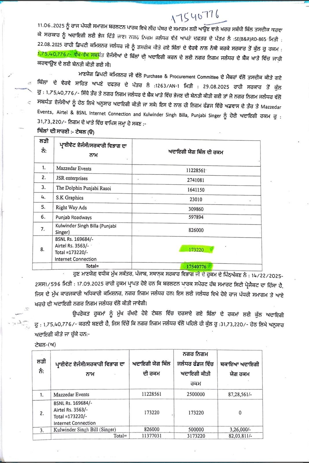 पूर्व जिला जालंधर कांग्रेस पार्टी के प्रधान बलराज ठाकुर ने बातचीत मैं बताया की जालंधर शहर के लोगों के टैक्स के पैसों का दुरुपयोग किया गया जैसे मजेदार इवेंट्स को1 करोड़ 12 लाख 28 हजार 561 रूपये ,इतना ही नहीं बल्कि जे एस आर एंटरप्राइजेज को लगभग 27 लाख 41 हजार के करीब, खाने का खर्चा 16 लाख 41 हजार,पंजाबी गायक का करीब 8 लाख 25 हजार,3 लाख 10 हजार के करीब उद्घाटन प्रचार का खर्चा इस प्रकार मिला जुला के 1 करोड़ 75 लाख के करीब खर्चा करेगी निगम। इसी प्रकार 31 लाख 73 हजार 220 रूपये तक की अदायगी कर भी चुका है निगम।