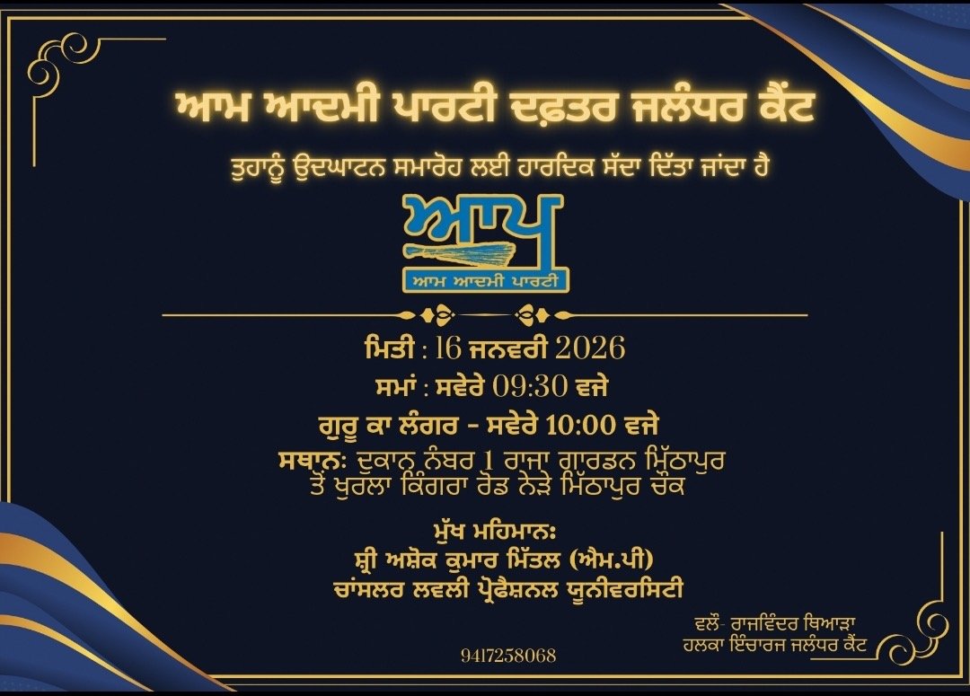 ਆਦਮੀ ਪਾਰਟੀ ਇੰਚਾਰਜ ਰਾਜਵਿੰਦਰ ਕੌਰ ਥਿਆੜਾ 2027 ਦੀ ਵਿਧਾਨ ਸਭਾ ਚੋਣਾਂ ਨੂੰ ਦੇਖਦੇ ਹੋਏ ਆਪਣਾ ਦਫਤਰ ਰਾਜਾ ਗਾਰਡਨ ਵਿੱਚ ਖੋਲ ਰਹੇ ਹਨ ।