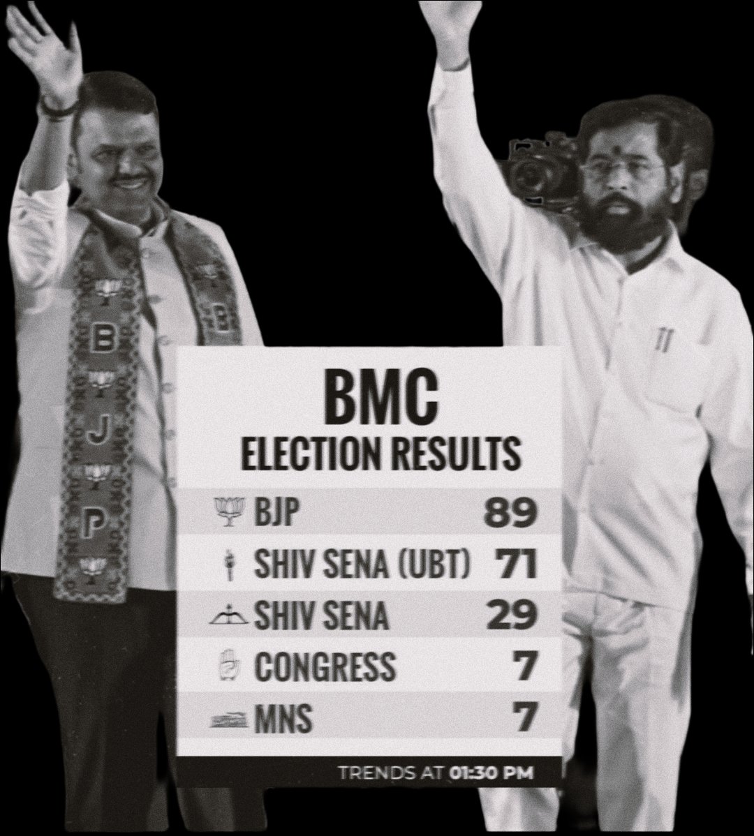 News Riders Tv: BMC चुनाव के नतीजों का ऐलान शुरू हो गया है। शुरुआती रुझानों में भारतीय जनता पार्टी ने बंपर बढ़त बना ली है। बृह्नमुंबई महानगरपालिका समेत महाराष्ट्र की 29 महानगरपालिकाओं में चुनाव गुरुवार को हुए थे।
