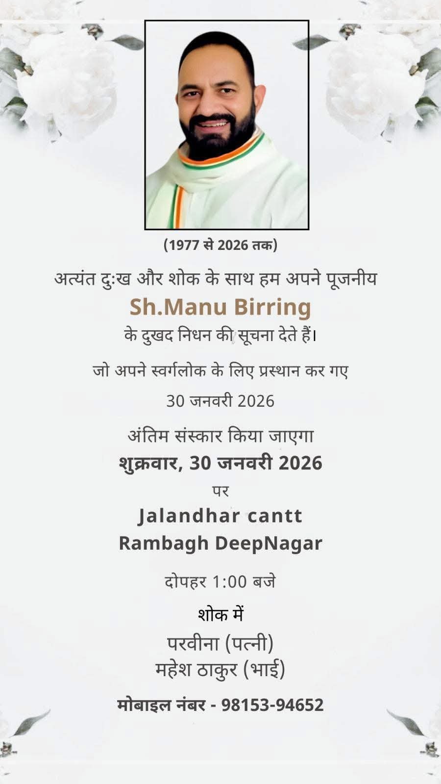 G2M जालंधर 30 जनवरी 2026:- जालंधर कांग्रेस पार्टी के दिग्गज नेता मनोज मल्होत्रा उर्फ मनु ब्रिंग का हुआ निधन।