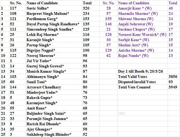 ਅੱਜ ਪੰਜਾਬ ਅਤੇ ਹਰਿਆਣਾ ਦੀ ਬਾਰ ਕੌਂਸਲ ਦੀਆਂ ਬੀਤੇ ਦਿਨੀ ਹੋਈਆਂ ਚੋਣਾਂ ਦੀਆਂ ਵੋਟਾਂ ਦੀ ਗਿਣਤੀ ਦੇ ਪਹਿਲੇ ਦਿਨ ਕੁੱਲ ਮਿਲਾ ਕੇ ਨੌ ਬੂਥ ਦੀਆਂ 4 ਹਜਾਰ ਵੋਟਾਂ ਦੀ ਵੀ ਗਿਣਤੀ ਨਹੀਂ ਪੂਰੀ ਹੋ ਸਕੀ, ਕੁਲ 3949 ਵੋਟਾਂ ਦੀ ਗਿਣਤੀ ਹੋਈ ਜਿਨਾਂ ਵਿੱਚੋਂ 93 ਵੋਟਾਂ ਰੱਦ ਕਰ ਦਿੱਤੀਆਂ ਗਈਆਂ ਅਤੇ ਚੋਣਾਂ ਲੜਨ ਵਾਲੇ ਉਮੀਦਵਾਰਾਂ ਦੇ ਖਾਤੇ ਵਿੱਚ 3856 ਵੋਟਾਂ ਦੀ ਵੰਡ ਬਤੌਰ ਪਹਿਲੀ ਪ੍ਰੈਫਰੈਂਸ ਵਜੋਂ ਗਿਣੀ ਗਈ ਜਿਸ ਵਿੱਚ ਸਵੀਰ ਸਿੱਧੂ 320 ਵੋਟਾਂ ਨਾਲ ਪਹਿਲੇ ਸਥਾਨ ਤੇ ਰਹੇ ਉਸ ਤੋਂ ਬਾਅਦ ਸਭ ਤੋਂ ਜਿਆਦਾ ਵਿਵਾਦਤ ਉਮੀਦਵਾਰ ਹਰਪ੍ਰੀਤ ਮੁਲਤਾਨੀ 234 ਪਹਿਲੀ ਪ੍ਰੈਫਰੈਂਸ ਵੋਟਾਂ ਨਾਲ ਦੂਜੇ ਸਥਾਨ ਤੇ ਰਹੇ, ਪਿਛਲੀ ਵਾਰ ਥੋੜੀਆਂ ਵੋਟਾਂ ਦੇ ਫਰਕ ਨਾਲ ਨਾ ਚੁਣੇ ਜਾਣ ਵਾਲੇ ਪ੍ਰਦੁਮਣ ਗਰਗ 153 ਵੋਟਾਂ ਨਾਲ ਤੀਜੀ ਨੰਬਰ ਤੇ ਬਣੇ ਹੋਏ ਹਨ।