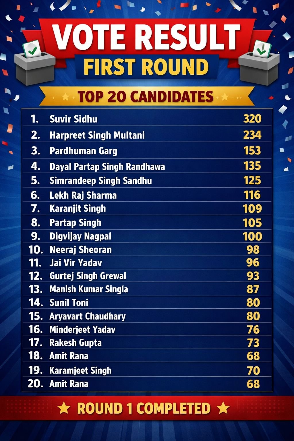ਪੰਜਾਬ ਦੇ ਪੰਜ ਵੱਡੇ ਸ਼ਹਿਰਾਂ ਜਲੰਧਰ, ਲੁਧਿਆਣਾ, ਅੰਮ੍ਰਿਤਸਰ, ਬਠਿੰਡਾ ਅਤੇ ਪਟਿਆਲਾ ਨਾਲ ਸੰਬੰਧਿਤ ਕੋਈ ਵੀ ਉਮੀਦਵਾਰ 50 ਵੋਟਾਂ ਦਾ ਅੰਕੜਾ ਵੀ ਪਾਰ ਨਹੀਂ ਕਰ ਪਾਇਆ, ਪਹਿਲੇ 18 ਉਮੀਦਵਾਰਾਂ ਵਿੱਚ ਹਰਿਆਣਾ ਦਬਦਬਾ ਸਾਫ ਨਜ਼ਰ ਆ ਰਿਹਾ ਹੈ ਤੇ ਪੰਜਾਬ ਨਾਲ ਸੰਬੰਧਿਤ ਉਮੀਦਵਾਰਾਂ ਦਾ ਮਾਣਾ ਪ੍ਰਦਰਸ਼ਨ ਇਸ ਵਾਰ ਵੀ ਜਾਰੀ ਹੈ।
