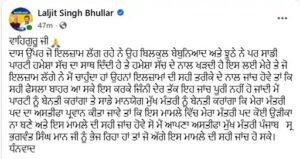 भुल्लर ने सोशल मीडिया पर पोस्ट शेयर करते हुए लिखा कि उन्होंने मुख्यमंत्री को अपना इस्तीफा भेज दिया है और उसे स्वीकार करने की मांग की है।