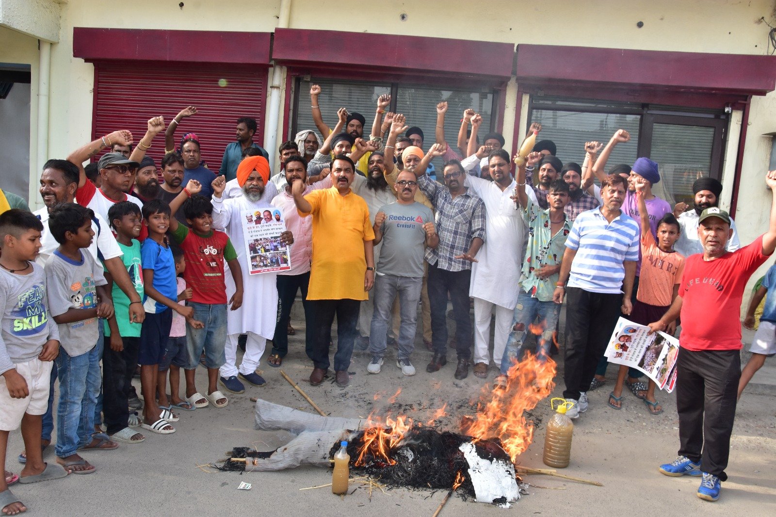 कैप्शन:भगवंत मान का पुतला जलाते हुए किशन लाल शर्मा,गुरप्रीत विक्की,शाम शर्मा, रणवीर नना,सुरेश कालिया, अजमेर सिंह बादल व अन्य।